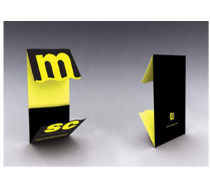 A promotional design is printed on one side and the card is folded in a way that it is readable from both sides of the display. A tent card is printed on flat card stock that has three score or fold lines. These lines guide you in assembling the card to form a triangular display. The space for the card base has slits that you can connect to form the bottom part of the table tent. When folded, two sides display the promotional layout while one side serves as the base